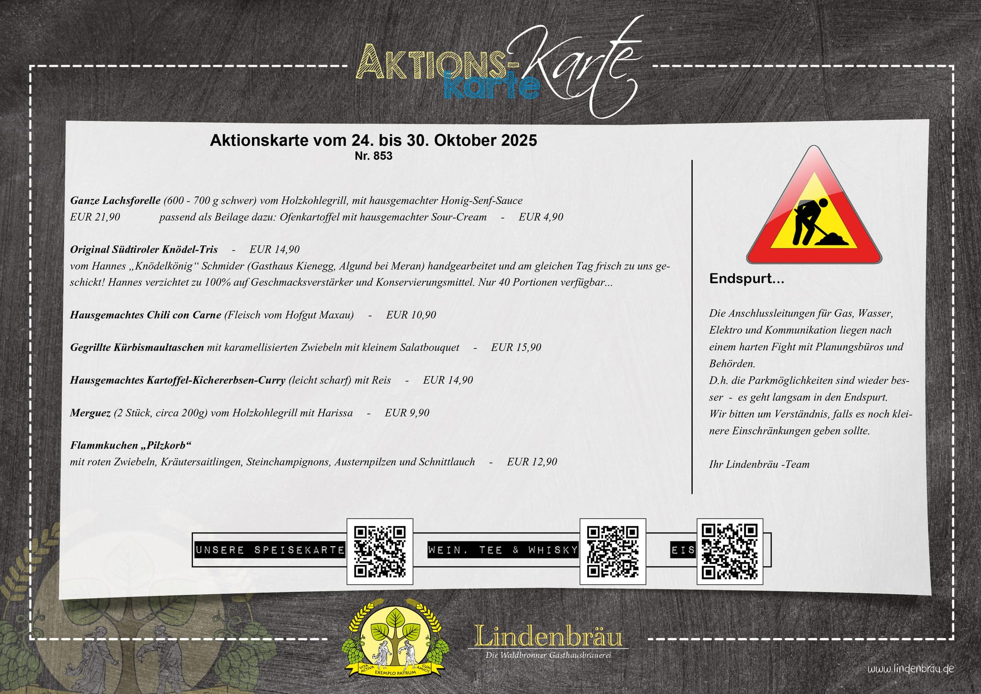 Unsere Wochenkarte vom 24. bis 30. Oktober 2025 Küchenchef Benjamin Bozic und sein Team wünschen guten Appetit!