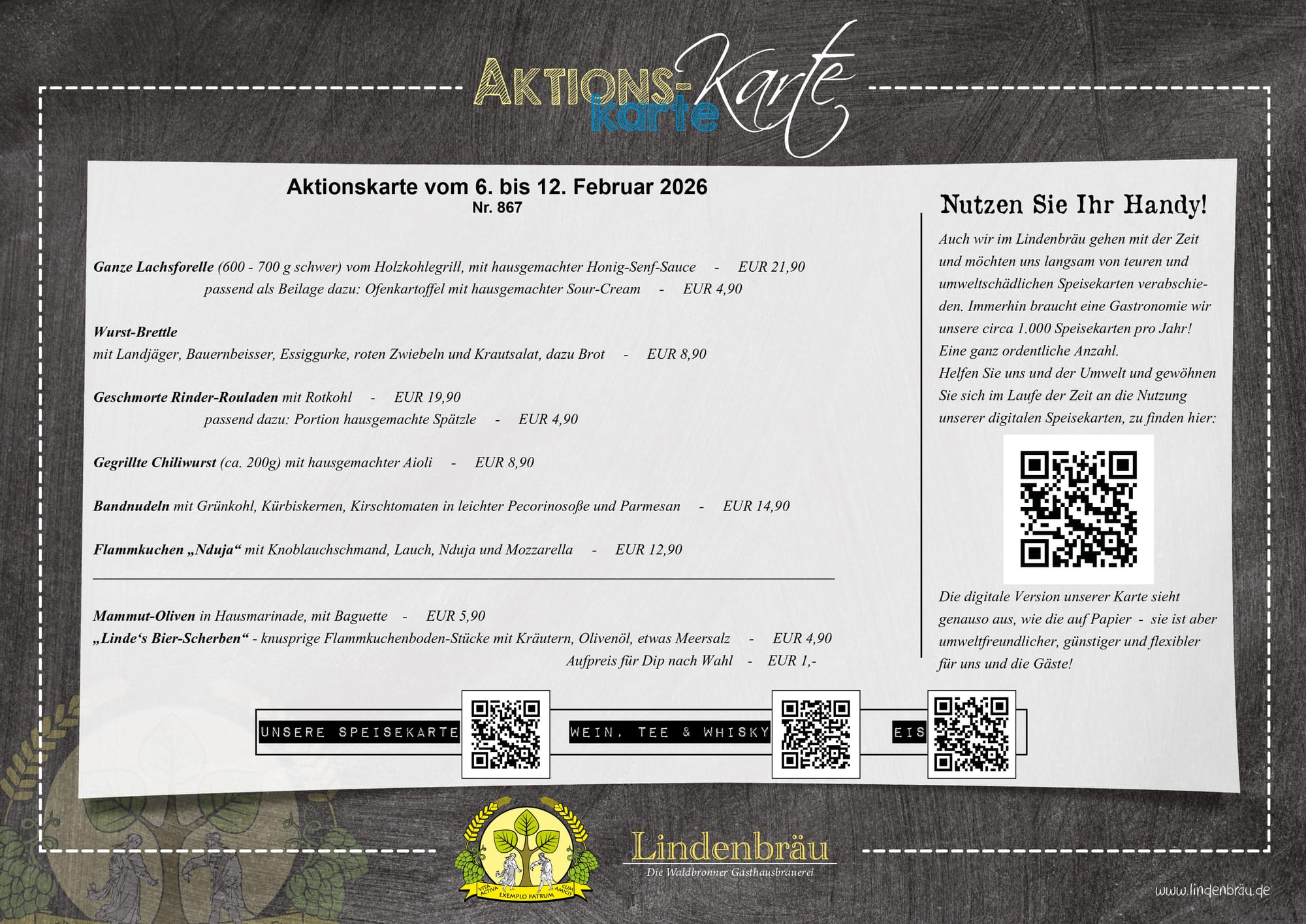 Unsere Wochenkarte vom 6. bis 12. Februar 2026 Küchenchef Benny Bozic und sein Team wünschen guten Appetit!